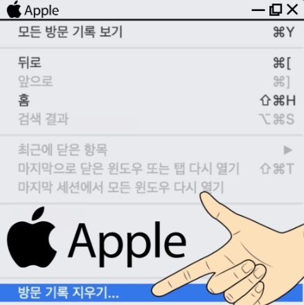 사파리를 실행 후 메뉴바에 보시면 "방문 기록 지우기" 또는 "방문 기록 및 웹사이트 데이터 지우기" 항목을 클릭하면 됩니다. 방문기록은 기간을 설정해서 지울 수 있고, 모든 방문 기록을 지정해 모두 삭제하는 방법도 있습니다.